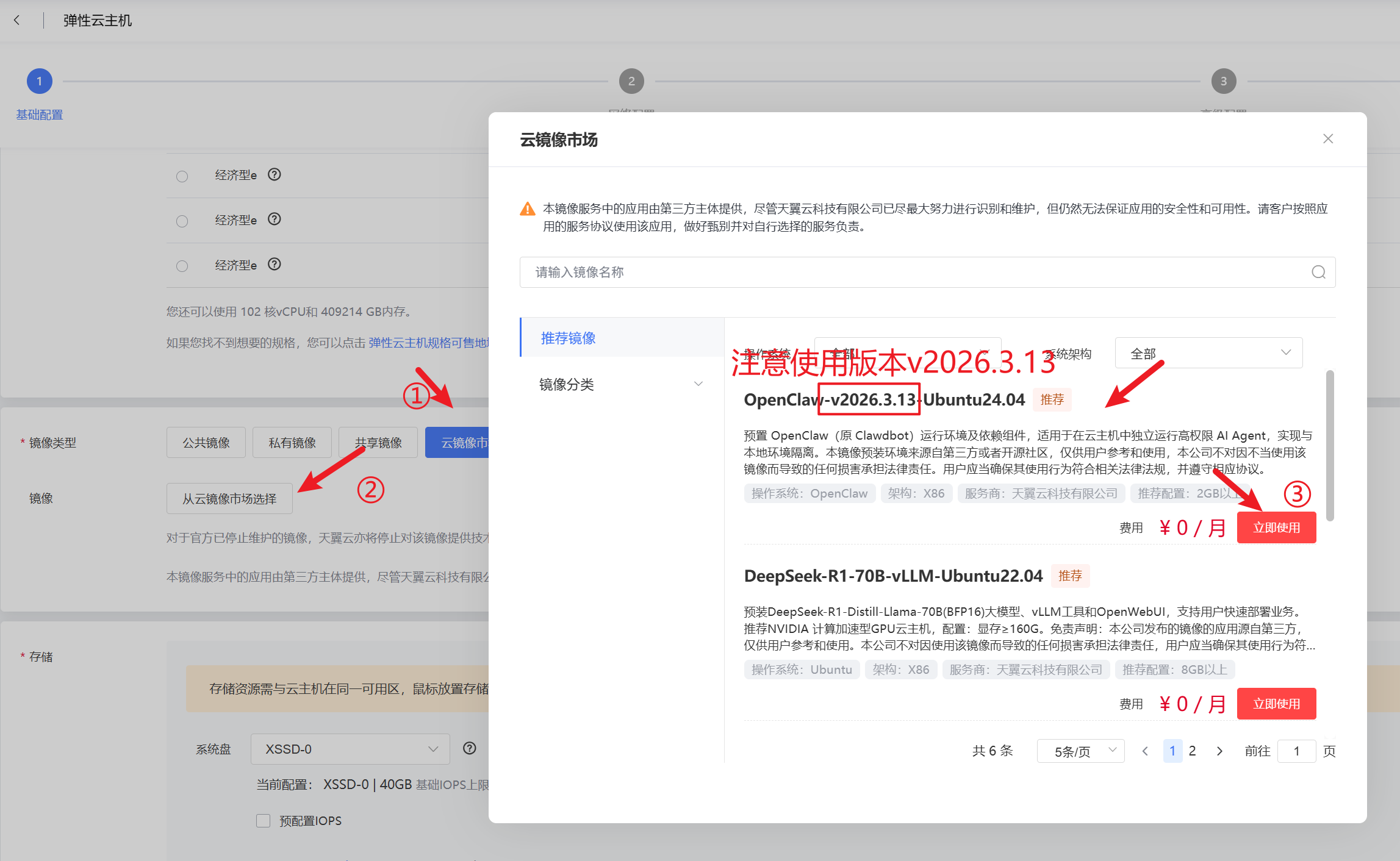 镜像类型选择云镜像市场/应用镜像,并选取“OpenClaw-v2026.3.13-Ubuntu24.04”镜像。