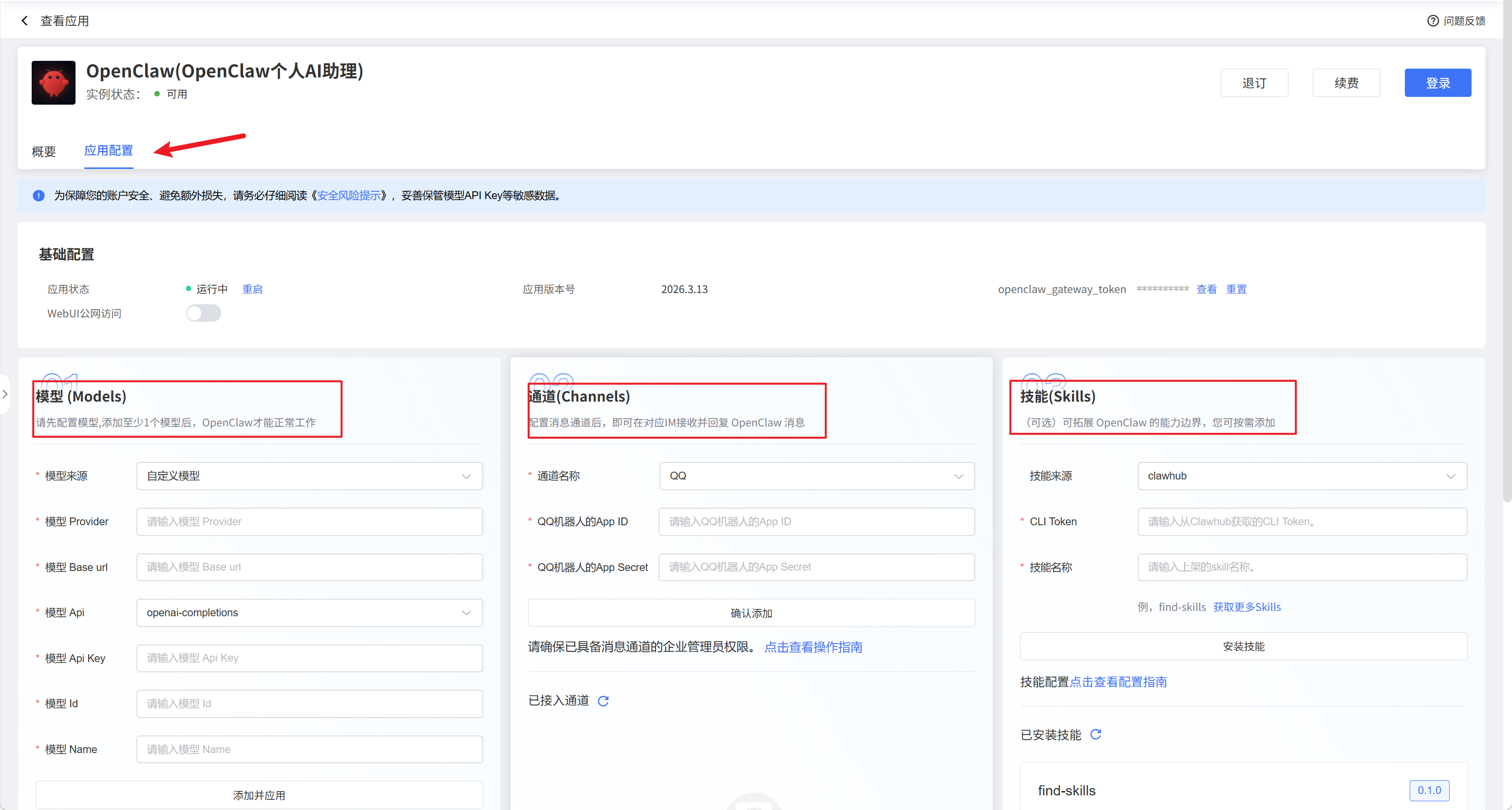 进入应用详情页,点击“应用配置”页签,在页面中完成模型配置、通道配置、技能配置后,即可开始使用OpenClaw。