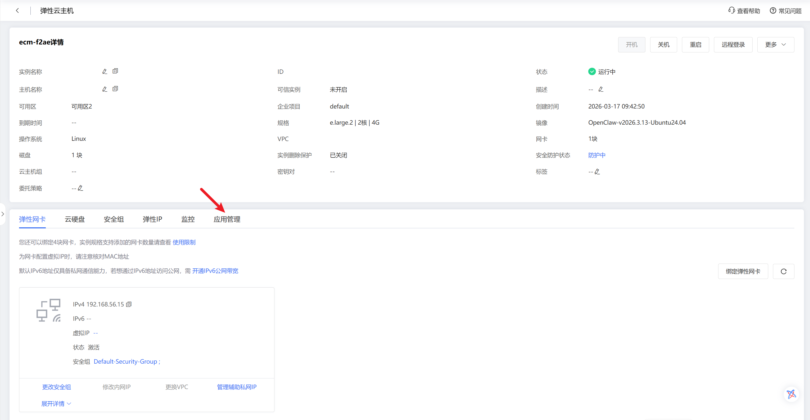 完成支付后,返回云主机控制台,确认云主机状态为“运行中”,进入云主机详情页,点击“应用管理”页签。
