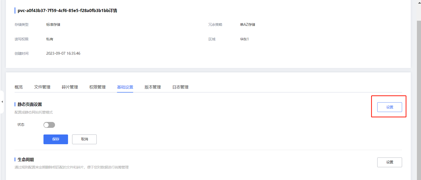 - 在ZOS控制台“基础设置”页面,找到“静态页面设置”,点击“设置”。