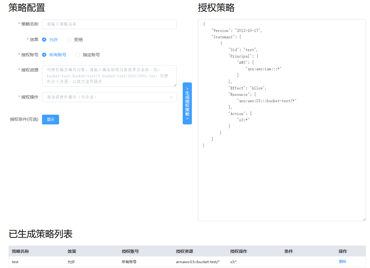 s3:PutBucketPolicy:表示允许配置桶策略。