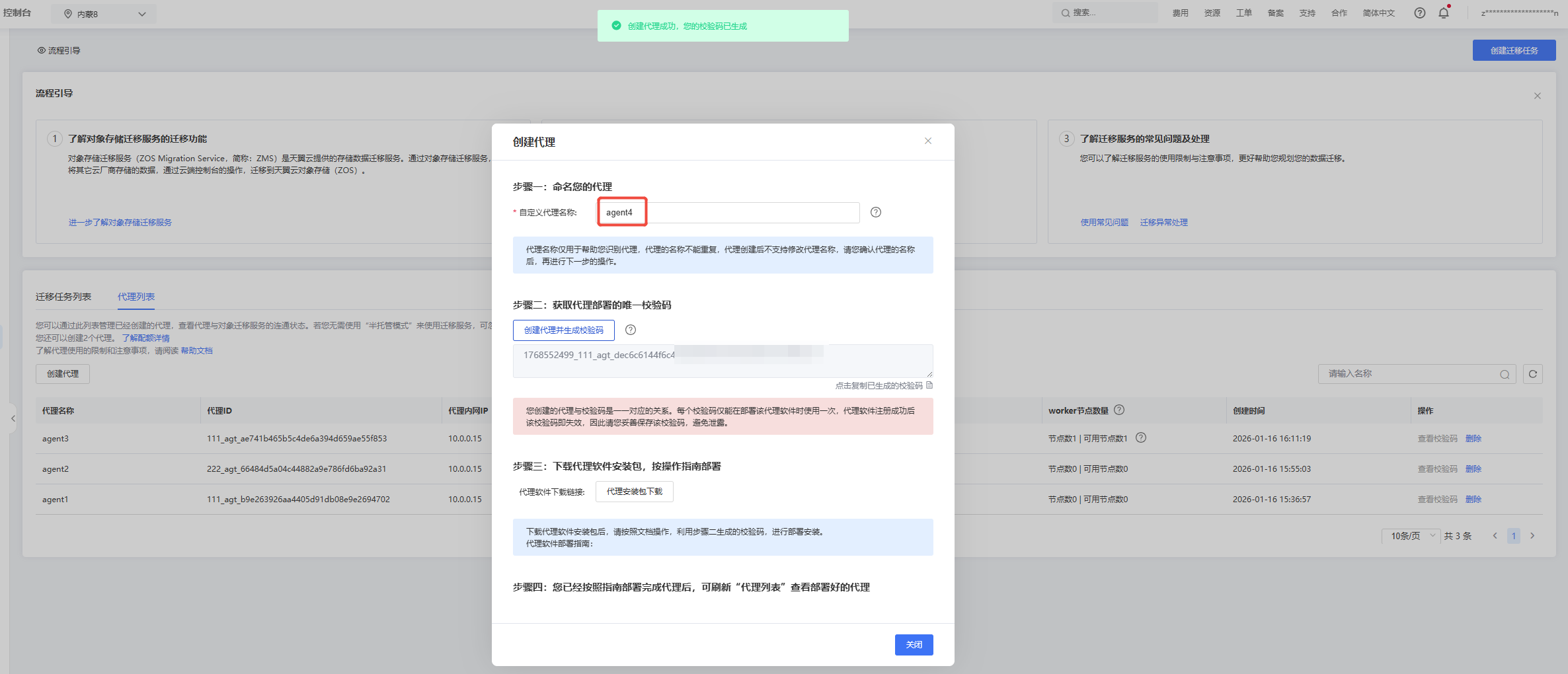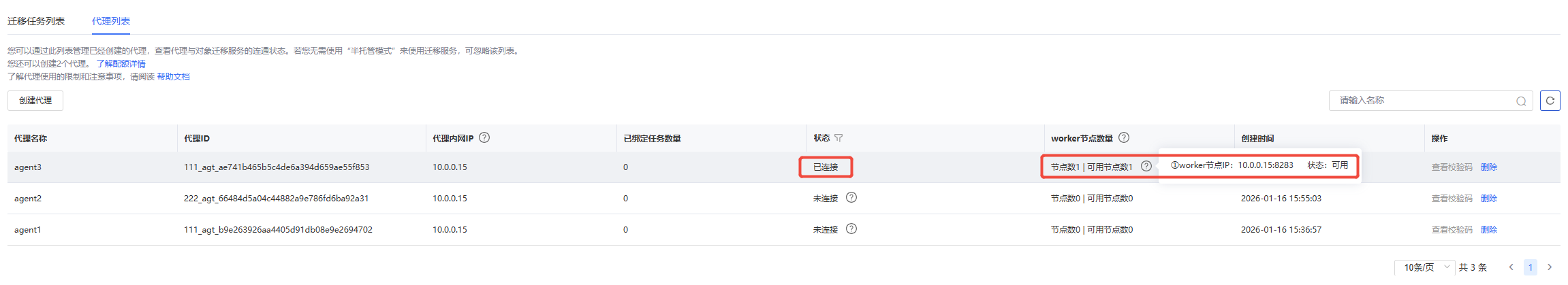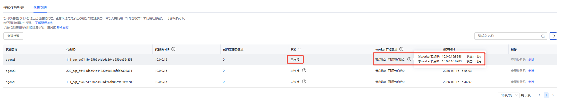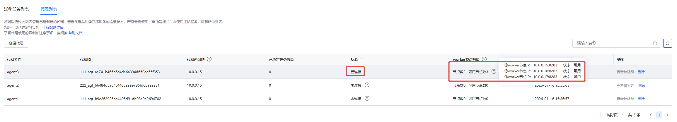 半托管Agent服务启动后,ZMS服务的控制台需要1-2min时间才能同步状态,您可以在“对象存储迁移-迁移任务-代理列表”中查看已部署代理的状态。
