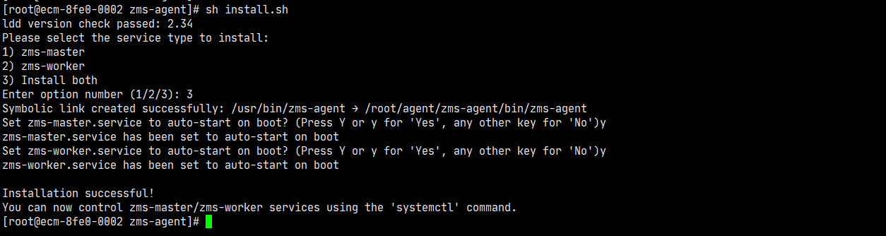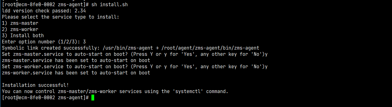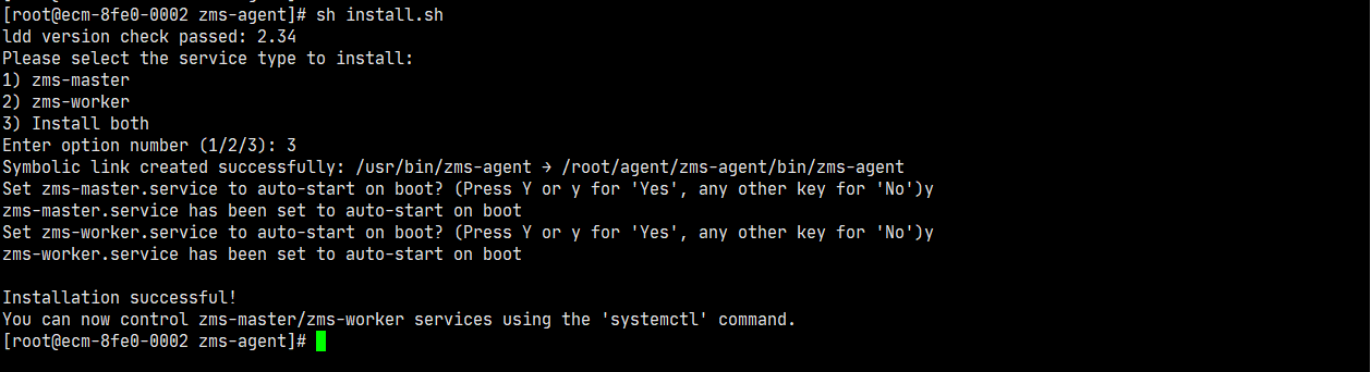 进入前置准备步骤二解压后的目录,执行install.sh脚本,选择zms-master、zms-worker两者都安装,并按需配置开启自启动。
