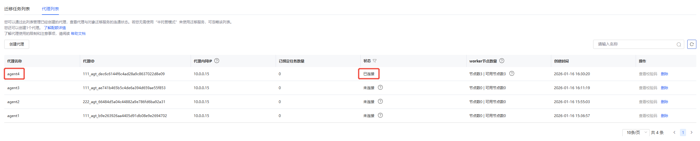 前往天翼云官网迁移服务代理列表界面查看半托管Agent状态。