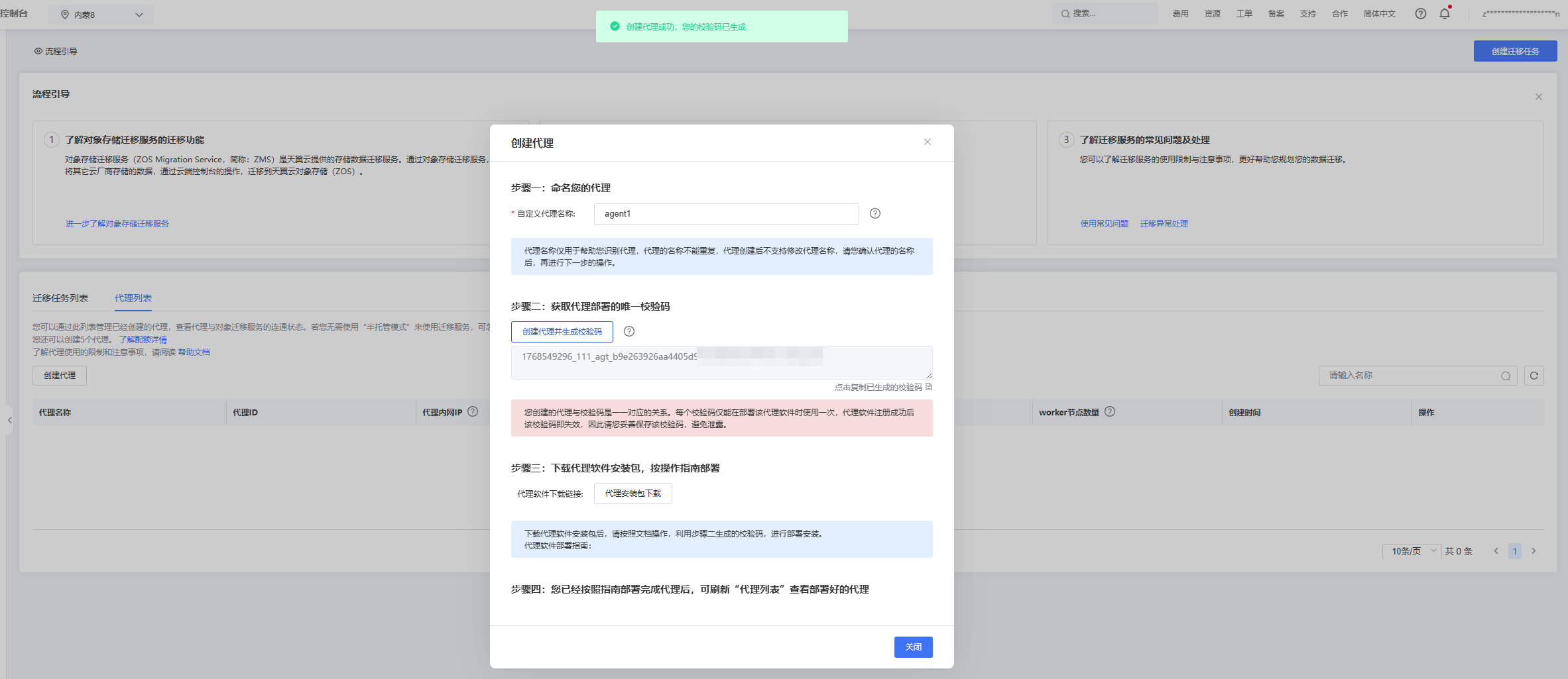 在天翼云官网迁移服务代理列表界面创建半托管Agent,并获取注册码。