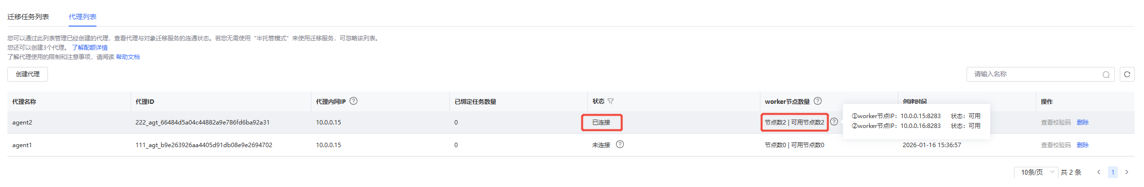 前往天翼云官网迁移服务代理列表界面查看半托管Agent下worker数量。