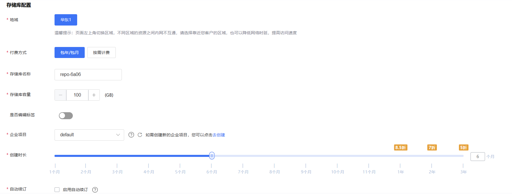 若选择包年/包月计费方式,您还需要选择创建时长和是否自动续订。