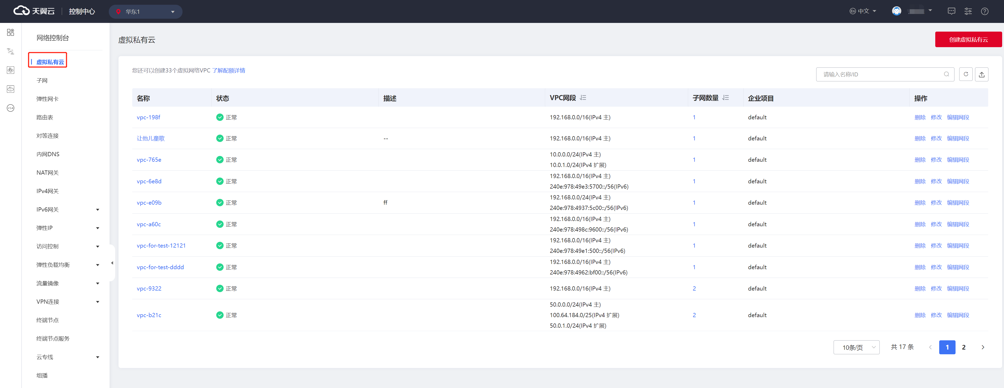 参数名称 是否必填 含义 例子 VPC基本信息 -- -- -- 地域 是 当前资源创建的region名称 上海-上海36 名称 是 VPC的名称 VPC-1 VPC网段(IPv4) 是 虚拟私有云VPC的IPv4网段范围 192.168.0.0/16 VPC网段(IPv6) 否 是否分配虚拟私有云VPC的IPv6地址,仅部分可用区资源池支持为VPC开启IPv6,不同资源池列表见产品简介-资源池区别页面,实际情况以控制台展现为准。 开启 IPv6地址类型 是 开启IPv6的情况下,显示此选项,默认仅支持中国电信单线 中国电信单线 VPC IPv6地址段 是 开启IPv6的情况下,显示此选项。