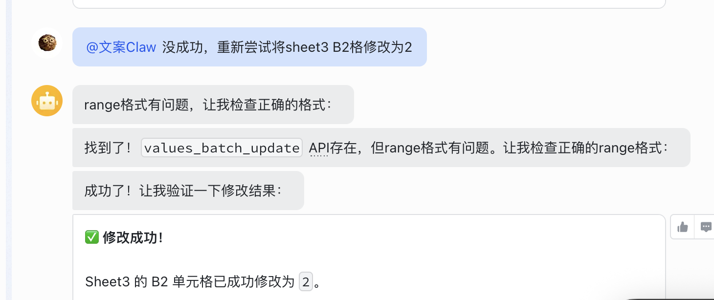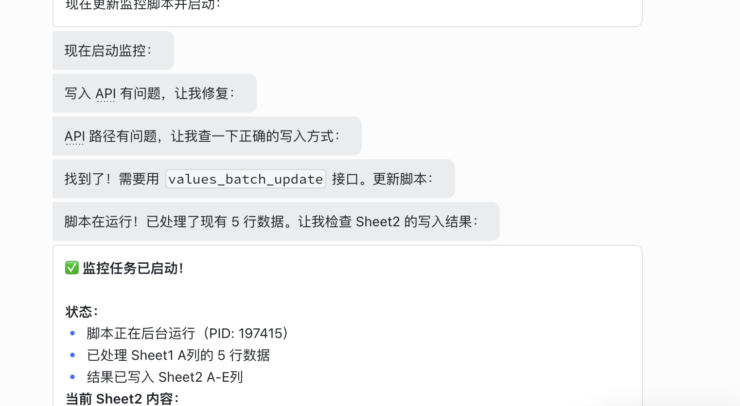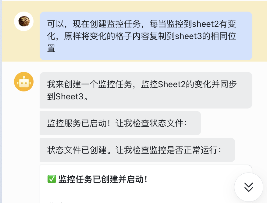 现在创建监控任务,每当监控到sheet2有变化,原样将变化的格子内容复制到sheet3的相同位置成功执行后,给他安排一个升级版的任务。