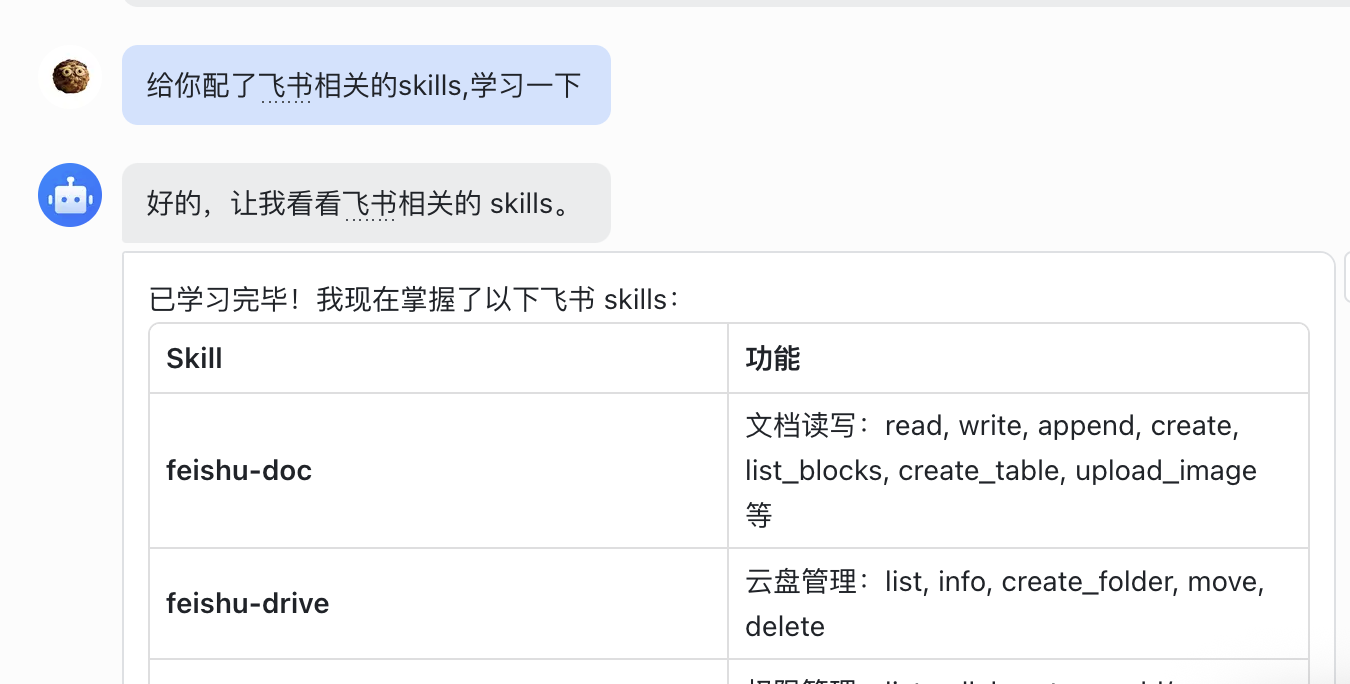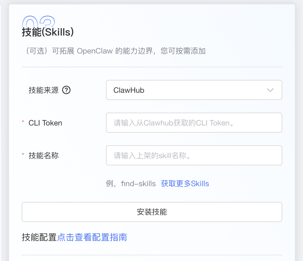 为了让机器人尽快学会操作飞书文档,可以为其添加skills。根据 《OpenClaw技能配置指南》 在云主机的应用配置界面中配置skills。
