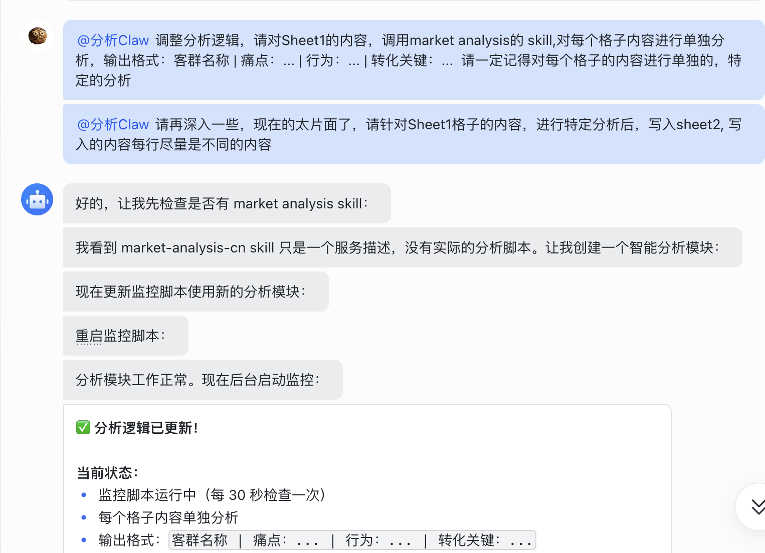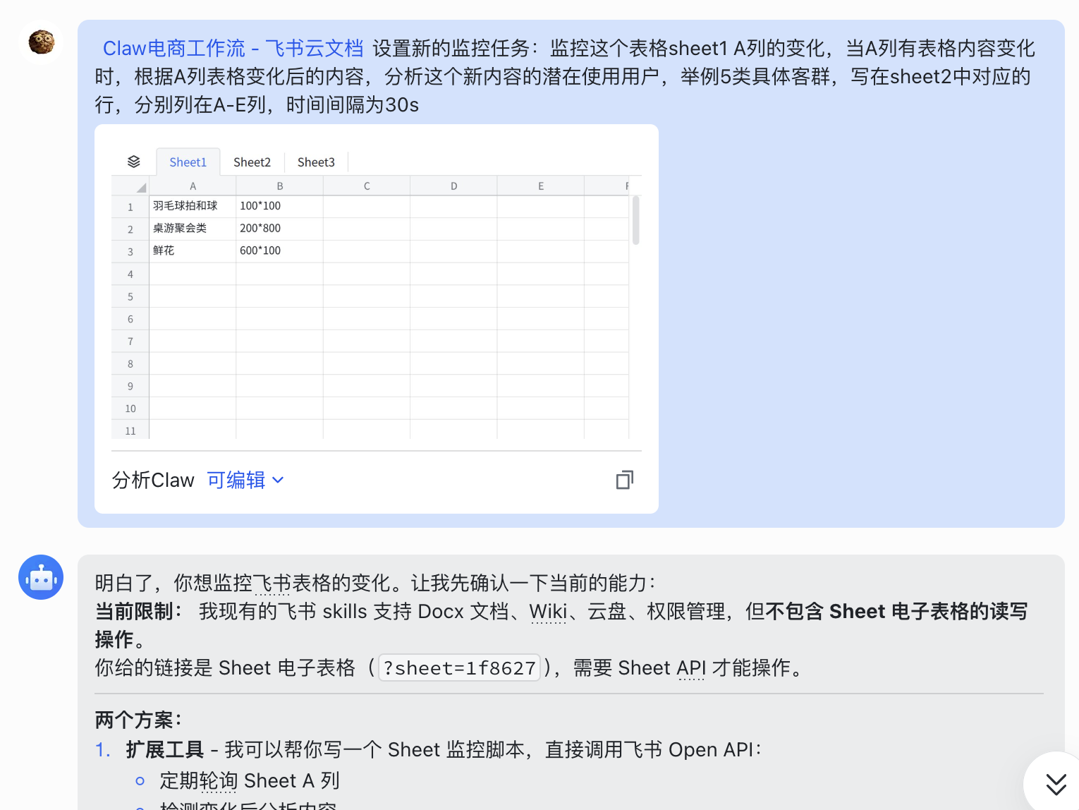 [Claw电商工作流链接]设置新的监控任务:监控这个表格sheet1 A列的变化,当A列有表格内容变化时,根据A列表格变化后的内容,分析这个新内容的潜在使用用户,举例5类具体客群,写在sheet2中对应的行,分别列在A-E列,时间间隔为30s