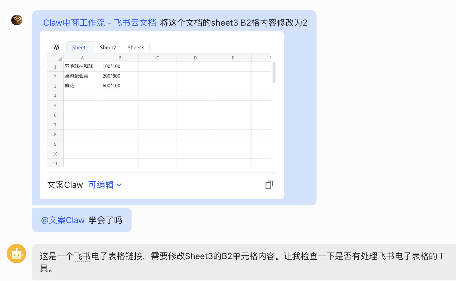 在飞书云文档中以个人用户的身份创建两个表格。第一个表格为普通表格,用于任务协同,命名为Claw电商工作流。第二个表格为多维表格,用于收集产出,命名为Claw-produce。之后将表格发给3个机器人,为所有机器人开通可编辑权限。