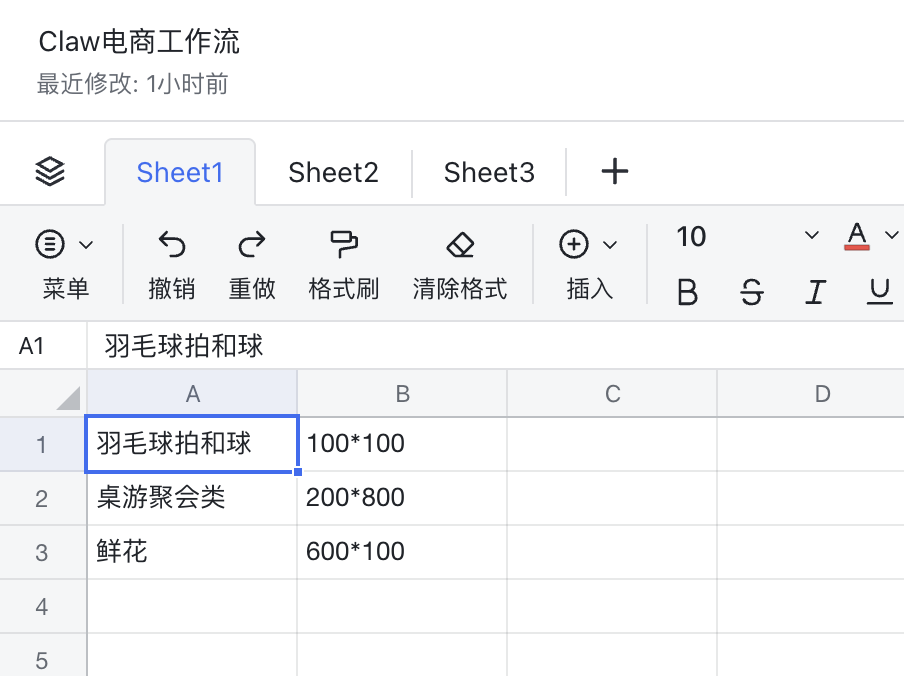 在创建的普通表格Claw电商工作流中,创建3个sheet,分别用于:用户输入【产品】、“分析Claw”输入【客群分析】、“文案Claw”根据客群分析输出宣传文案。