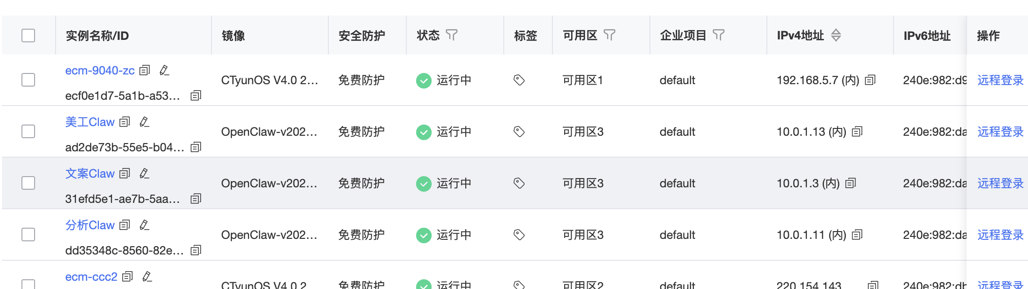 按照 《VPC网络中部署多机多龙虾》 描述的步骤,部署多机多龙虾。在此,我们以部署三台为例。在按照上文部署后,您已经拥有了三台部署好龙虾的云主机和三个接入主机的飞书机器人。