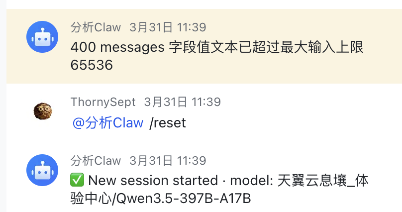 代表在当前长连接中输入的文本已经超过上限,给机器人发送 /reset 即可恢复。