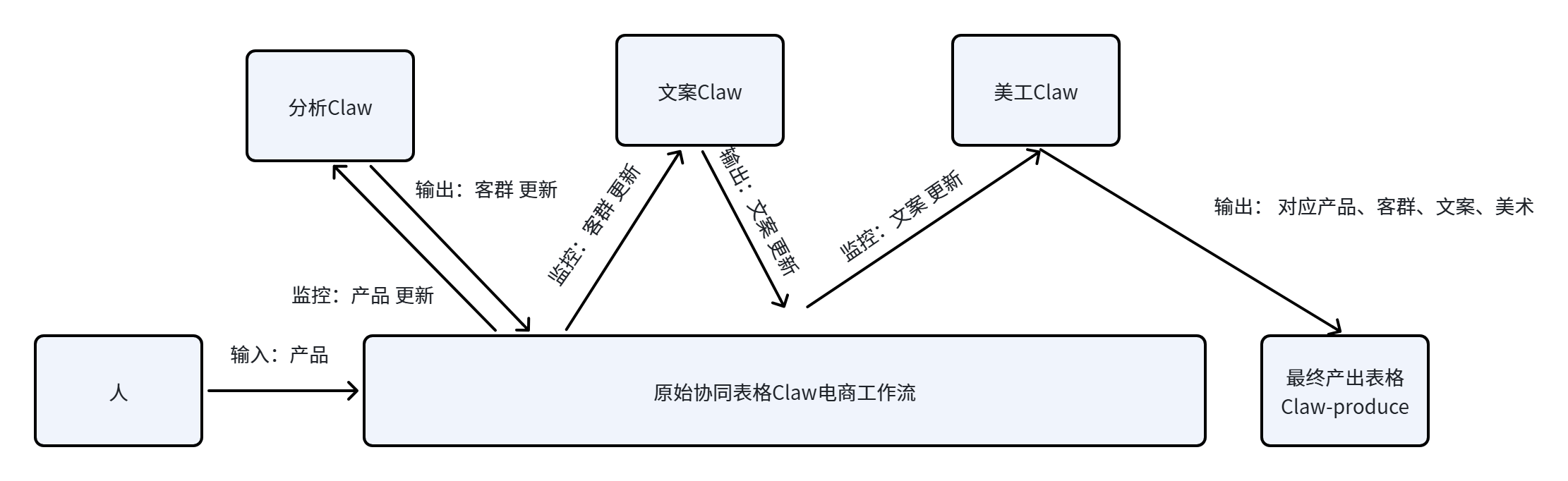 希望通过“分析Claw”将市场和产品客群情况分析后,交给“文案Claw”,之后“文案Claw”生成针对不同客群的文案,由“美工Claw”负责生成不同客群和不同营销场景的图片素材。多个龙虾之间协同通信采用Agent与飞书表格交互的方式,协调Agent之间彼此通信与任务流转,同时将每个Agent的输出做记录已观察工作过程。