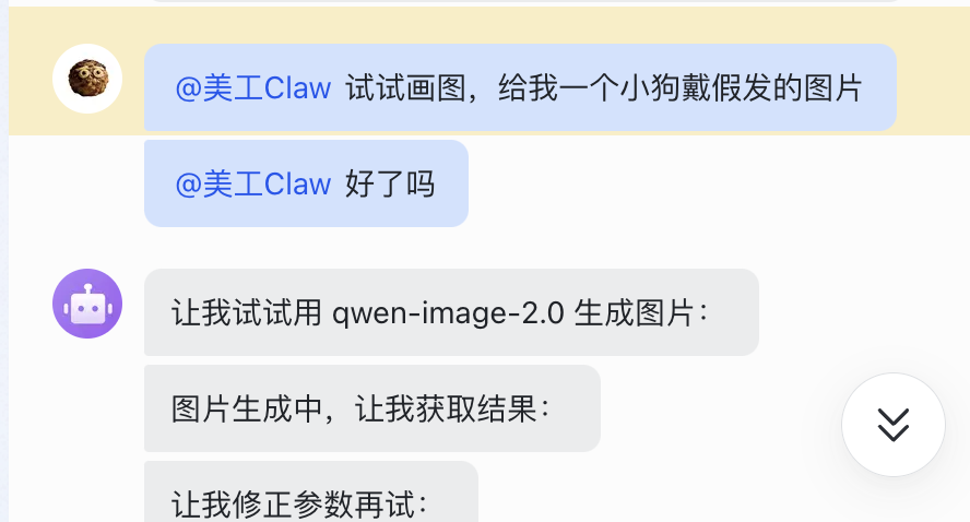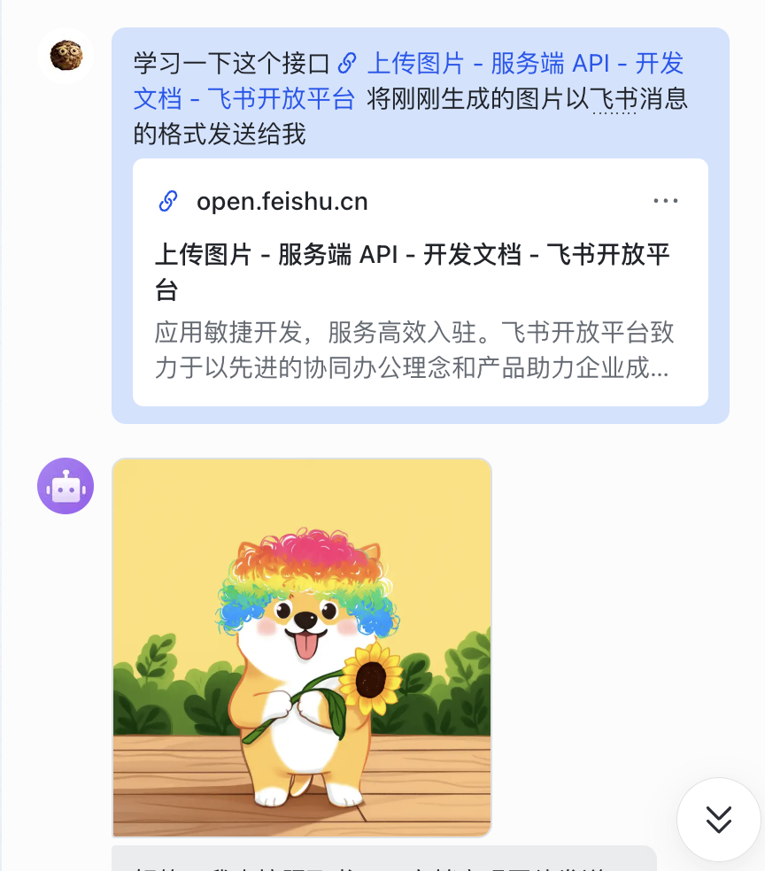 可以看到“美工Claw”无法理解,之后,让“美工Claw”学习网址:https://open.feishu.cn/document/uAjLw4CM/ukTMukTMukTM/reference/im-v1/image/create,然后发送图片。