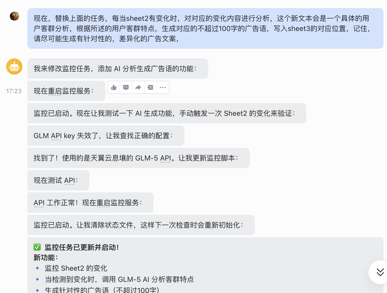 现在,替换上面的任务,每当sheet2有变化时,对对应的变化内容进行分析,这个新文本会是一个具体的用户客群分析,根据所述的用户客群特点,生成对应的不超过100字的广告语,写入sheet3的对应位置,记住,请尽可能生成有针对性的,差异化的广告文案在电商工作流表格中输入一些商品进行测试。可以看到机器人的监控以及生成结果成功了,其中“文案Claw”的文案生成工作会执行的慢一些,但是他在不久后都可以完成所有的任务。