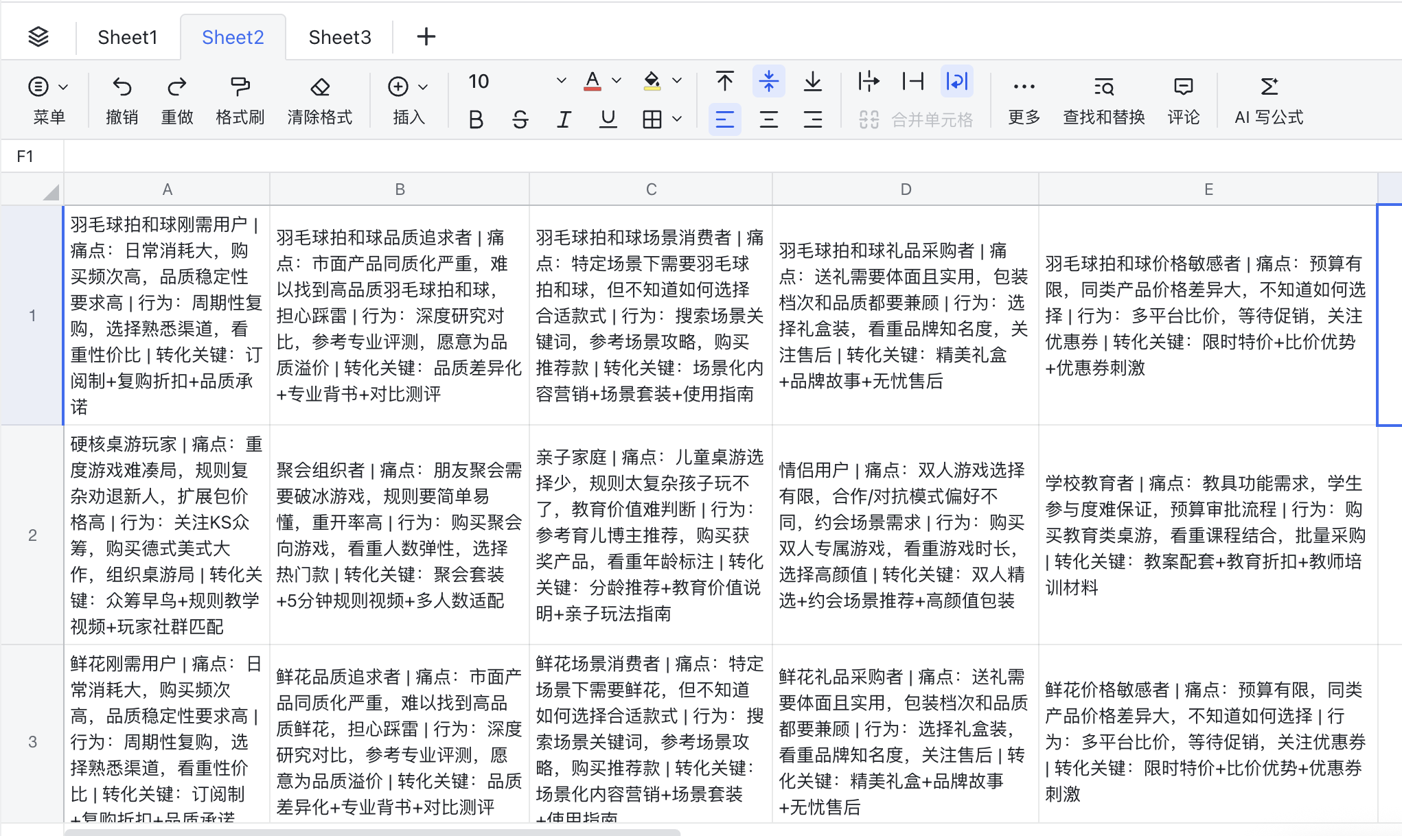 Sheet2完全由“分析Claw”输入,“分析Claw”会根据在sheet1里用户输入的商品名称自动分析当前商品的客群痛点以及他们的市场需求。