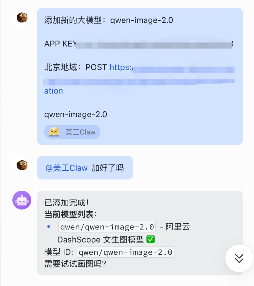 根据您的需要,购买有文生图、图生图能力的大模型,以与机器人对话的模式添加到Claw能力中,您需要提供:大模型名称、APP KEY、回调地址、提供商。使用与机器人对话的形式,让“美工Claw”新增加图片相关大模型,当“美工Claw”返回如下信息时,则视为添加成功。