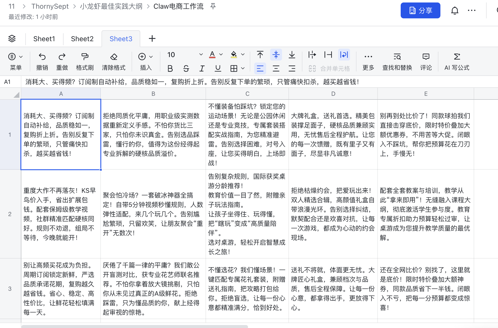 Sheet3完全由“文案Claw”输入。“文案Claw”会根据“分析Claw”在sheet2里输入的客群痛点生成对应的营销文案。