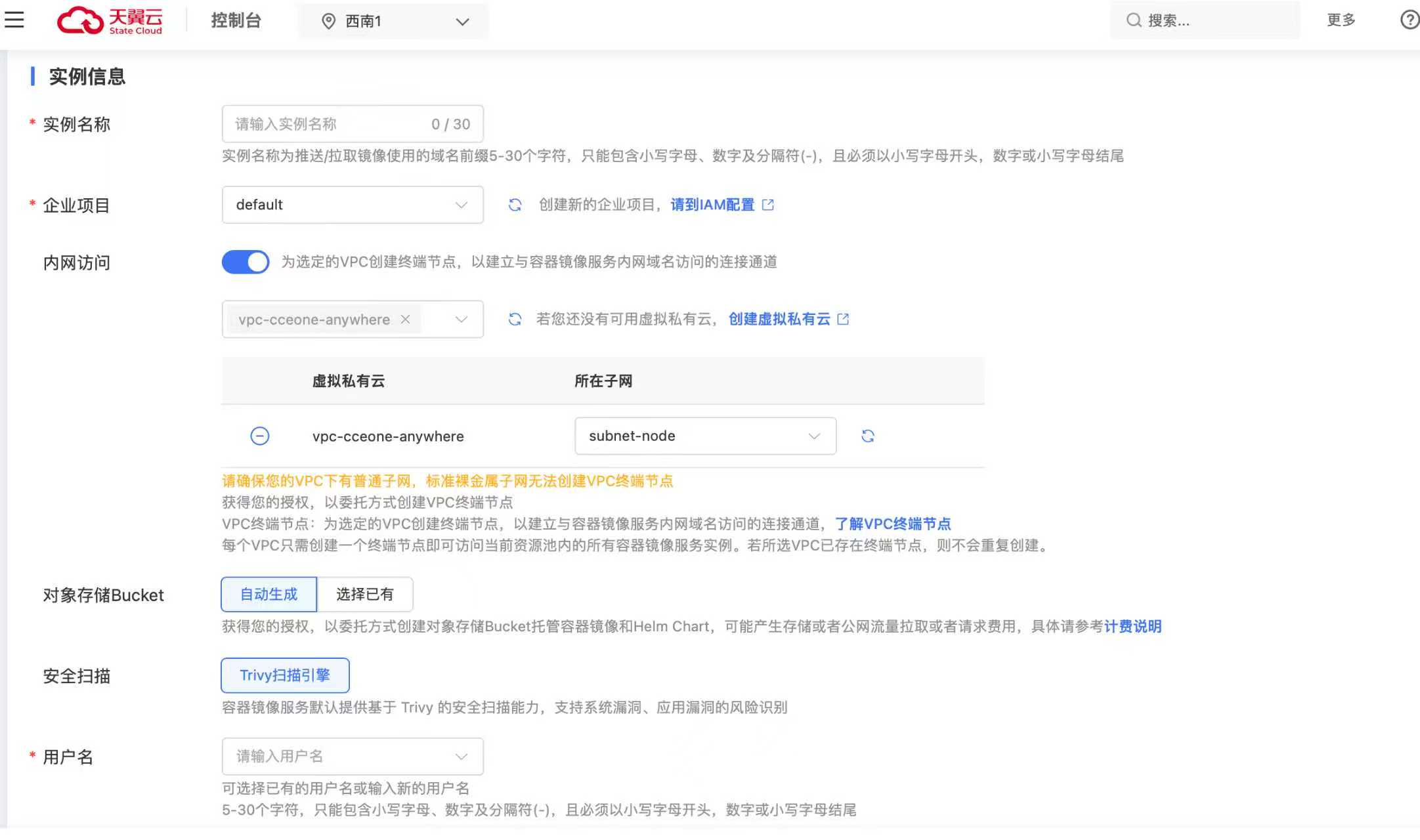 3、在开通页面填写实例名称,配置内网访问权限,选择或创建对象存储桶,并设置用于镜像推送和拉取的用户名及密码。