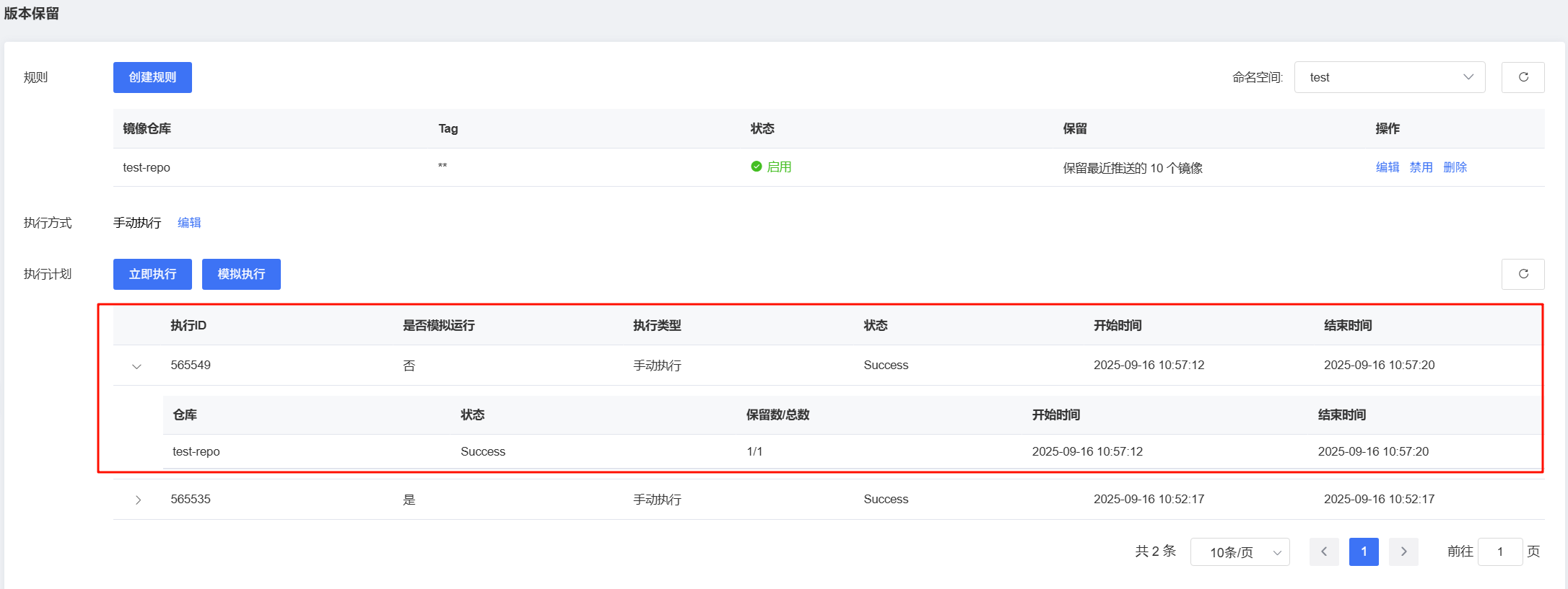 点击执行计划右侧的立即执行或模拟执行按钮以手动执行规则。其中模拟执行将不会真正删除镜像版本。