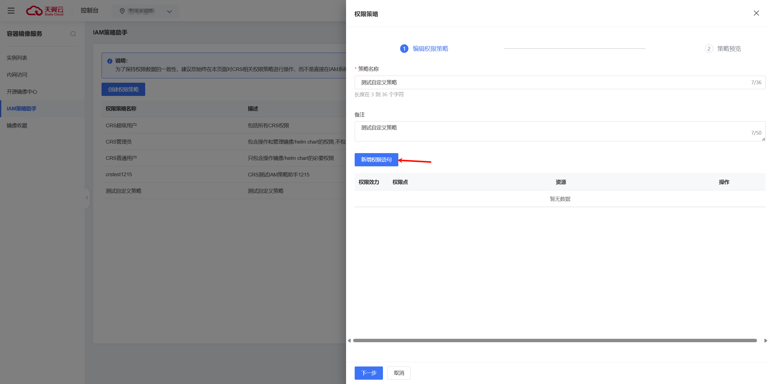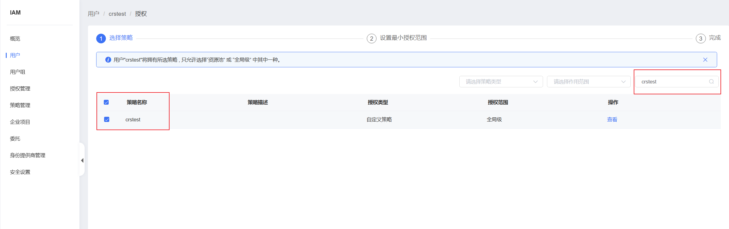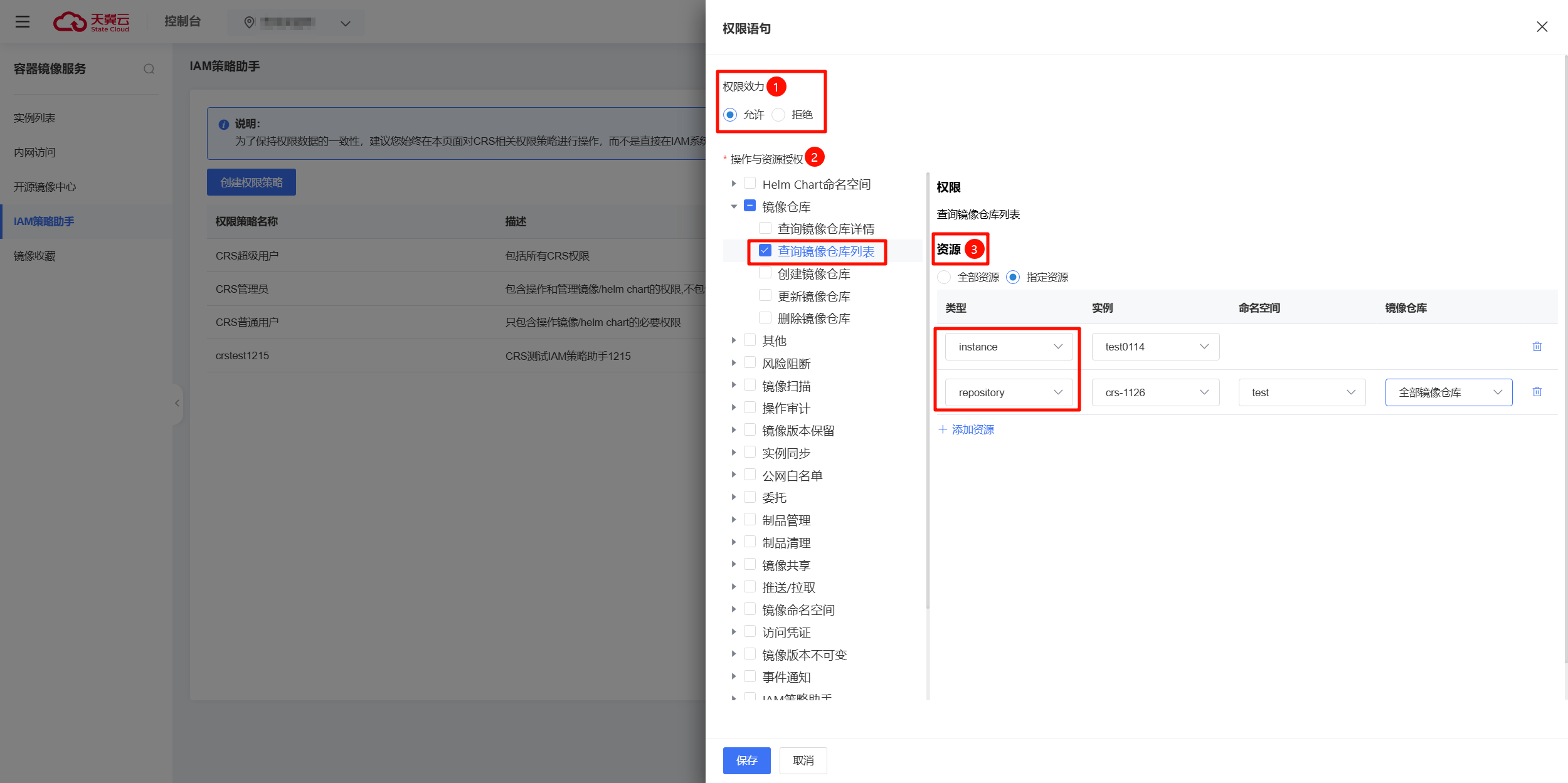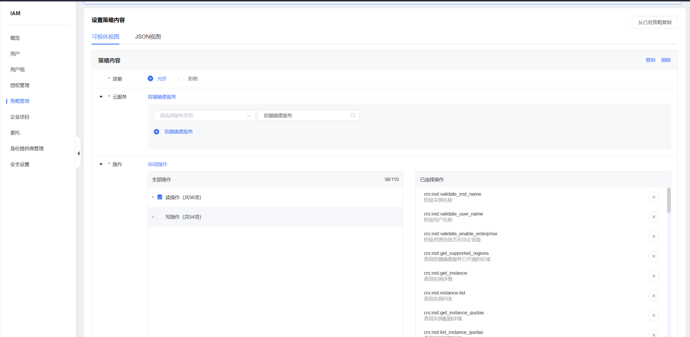 操作权限的资源:根据所选的操作权限,部分权限支持配置限定资源范围,例如实例、命名空间、镜像仓库等。具体可配置的资源类型请参考文档配置IAM权限-CRS资源权限控制。