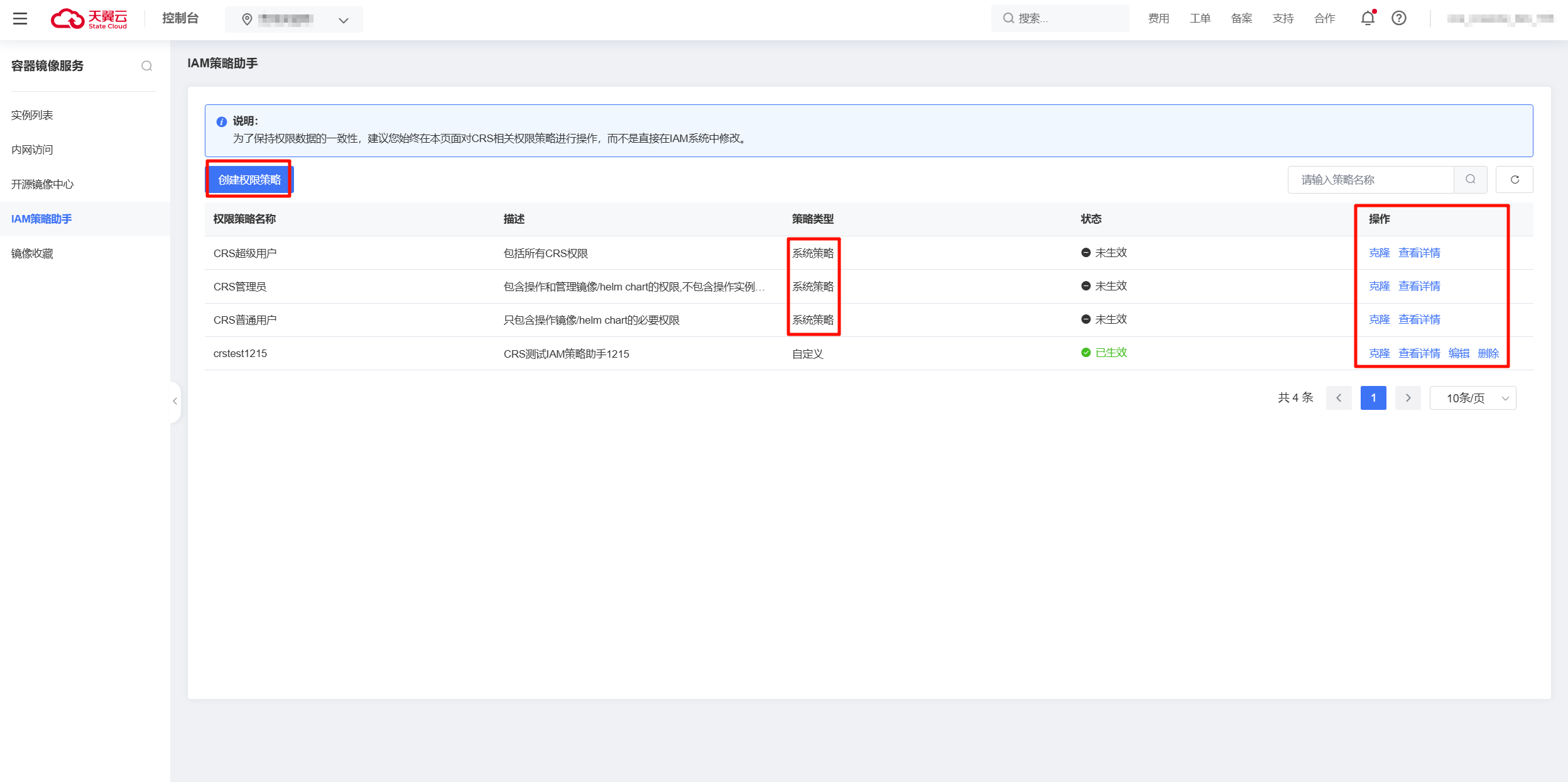 状态栏会显示自定义策略在IAM的生效状态。 例如,如果策略在IAM控制台中被修改,导致与IAM策略助手中的策略内容不一致,状态栏将显示未生效。 为了保持策略的一致性和可管理性,强烈建议您使用IAM策略助手统一管理您的CRS相关自定义策略。