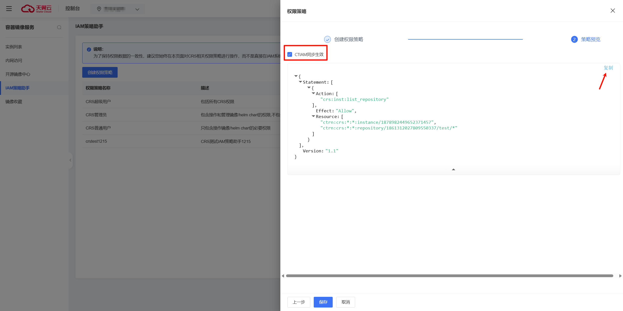 推荐勾选CTIAM同步生效, 默认情况下,IAM同步生效 选项会被勾选。 强烈建议您保持勾选此选项,以便在IAM控制台同步生成对应的自定义策略,方便统一管理。