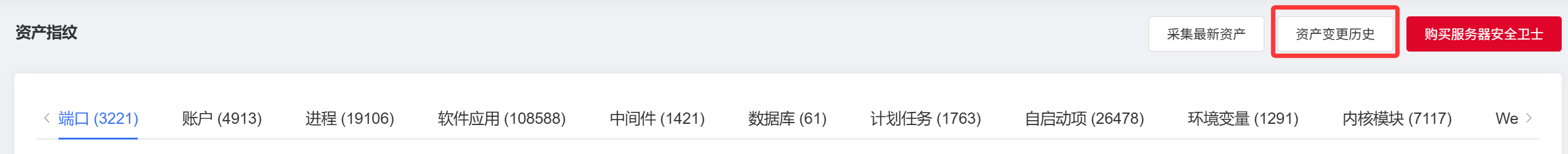 资产变更历史页面记录账户、软件应用、自启动项资产指纹的变更历史。