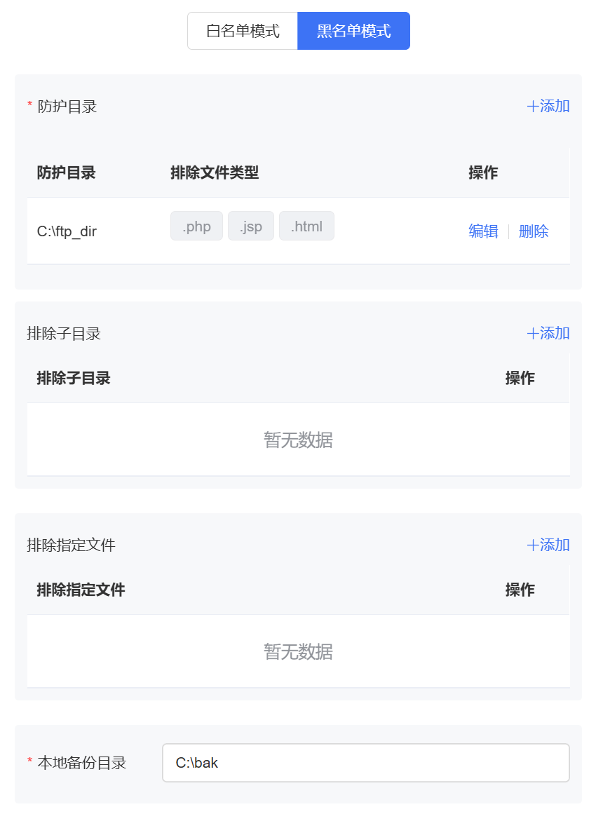 黑名单模式支持添加防护目录、排除子目录、排除文件类型、排除指定文件和本地备份目录,配置完成后,即开始防护目录下所有未排除的子目录、文件类型和指定文件。