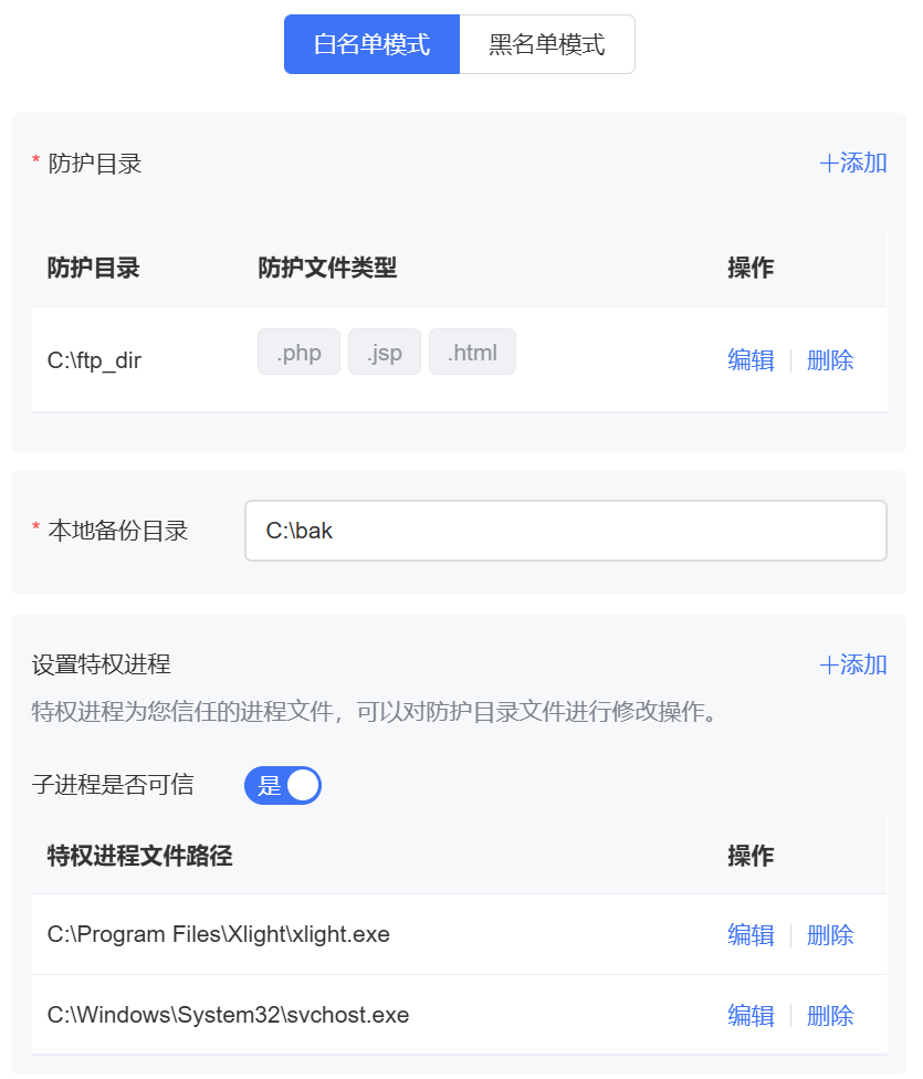 白名单模式:会对添加的防护目录和文件类型进行保护。