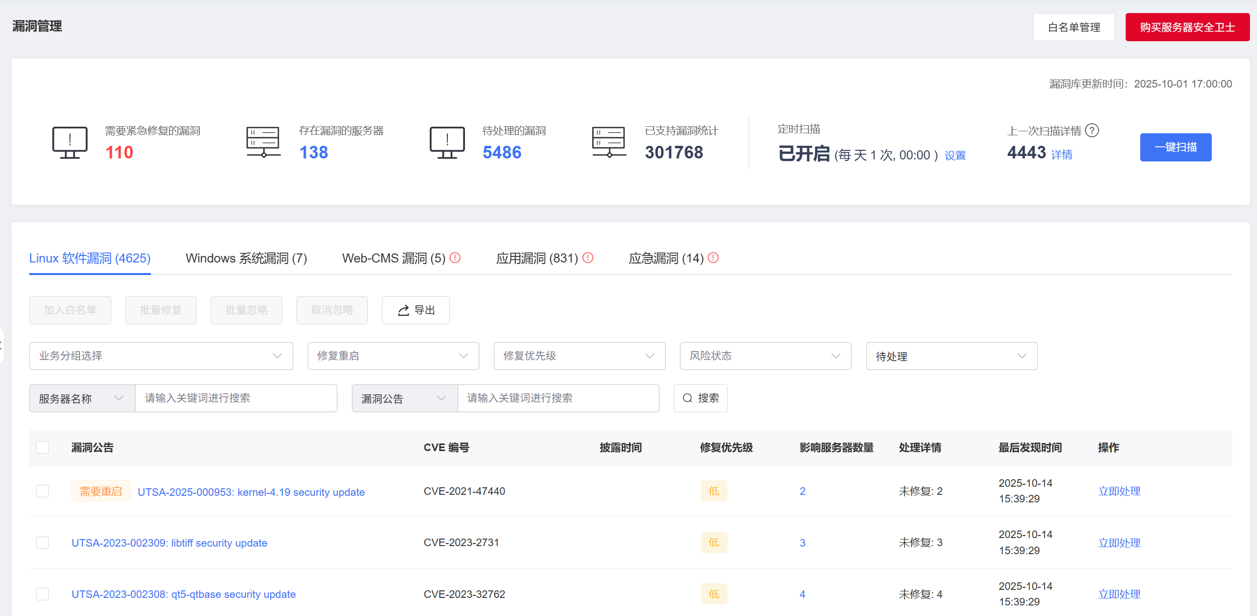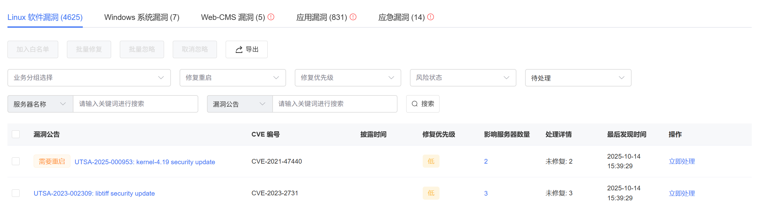 漏洞扫描页面下方的漏洞列表中展示本次扫描的漏洞情况,按照漏洞类别分页签展示,包括漏洞公告、CVE编号、修复优先级、影响服务器数量、处理详情、最后发现时间。