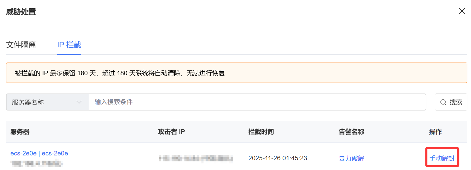 配置完成后可在“告警中心 > 威胁处置”模块查看拦截的IP或隔离的文件,可单击“操作”列的“手动解封”或“恢复”为误报IP和文件解封。