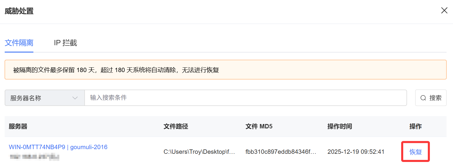 自动隔离后,若出现误报,可在告警列表中对文件进行恢复。