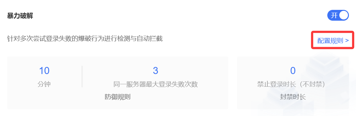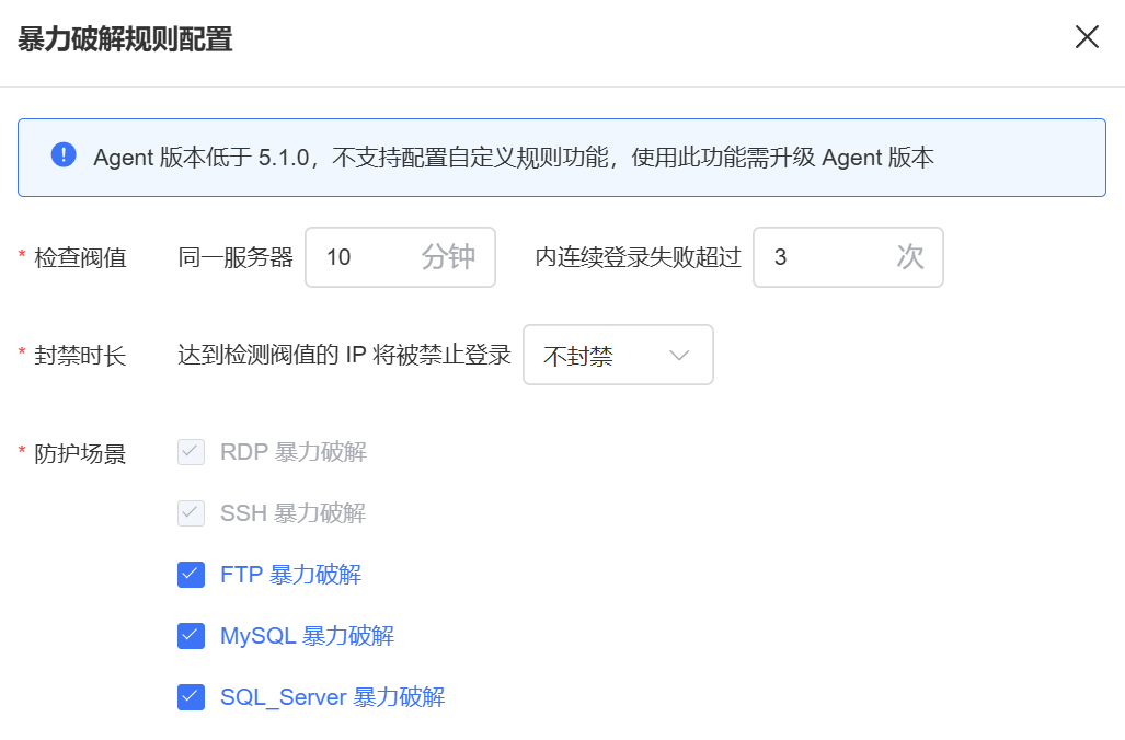 - 配置暴力破解规则参数。 - 参数说明如下: - 参数 - 说明 - 检查阈值 - 配置服务器在一段时间内连续登录失败超过的次数。 - 时间配置限制:1-1440分钟。 - 登录失败次数限制:1-100次。 - 封禁时长 - 选择封禁时长,支持选择:不封禁、5分钟、15分钟、30分钟、1小时、2小时、6小时、12小时、24小时。 - 防护场景 - 选择需要配置的防护场景,默认选择RDP暴力破解、SSH暴力破解,支持选择FTP暴力破解、MySQL暴力破解、SQL_Server暴力破解。