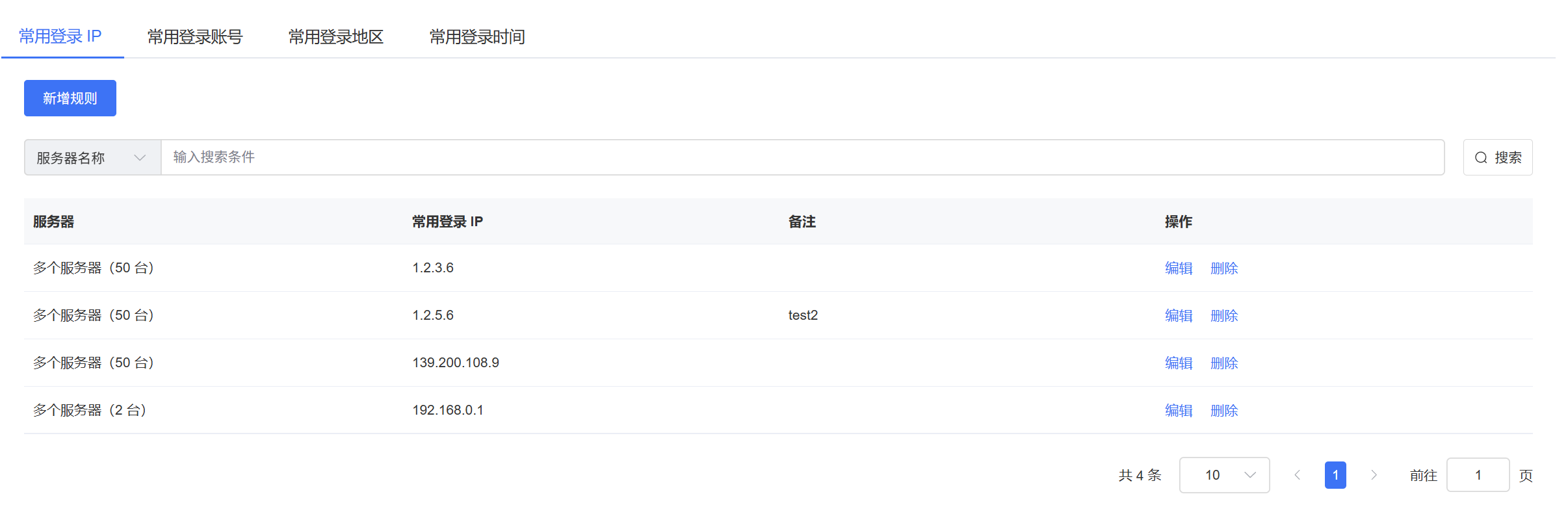 常用登录管理模块支持配置:常用登录IP、常用登录账号、常用登录地区、常用登录时间。