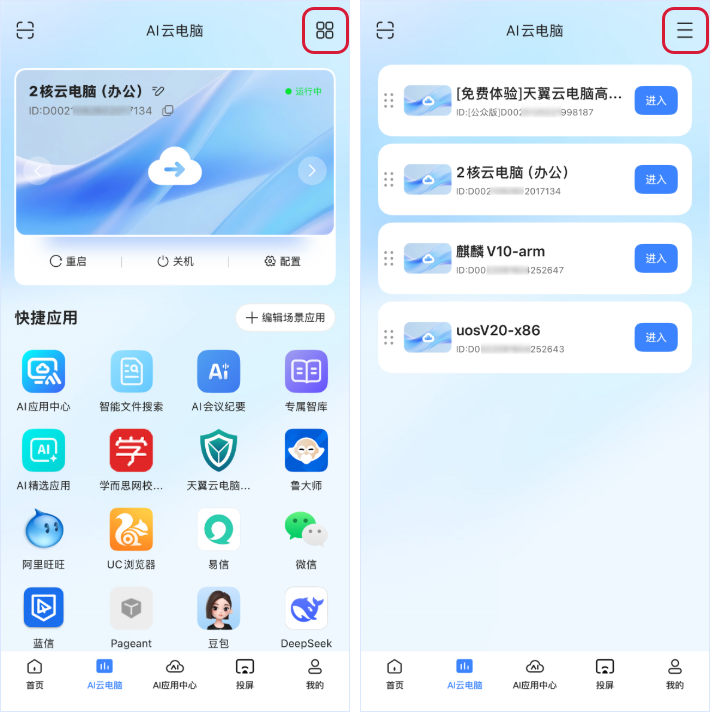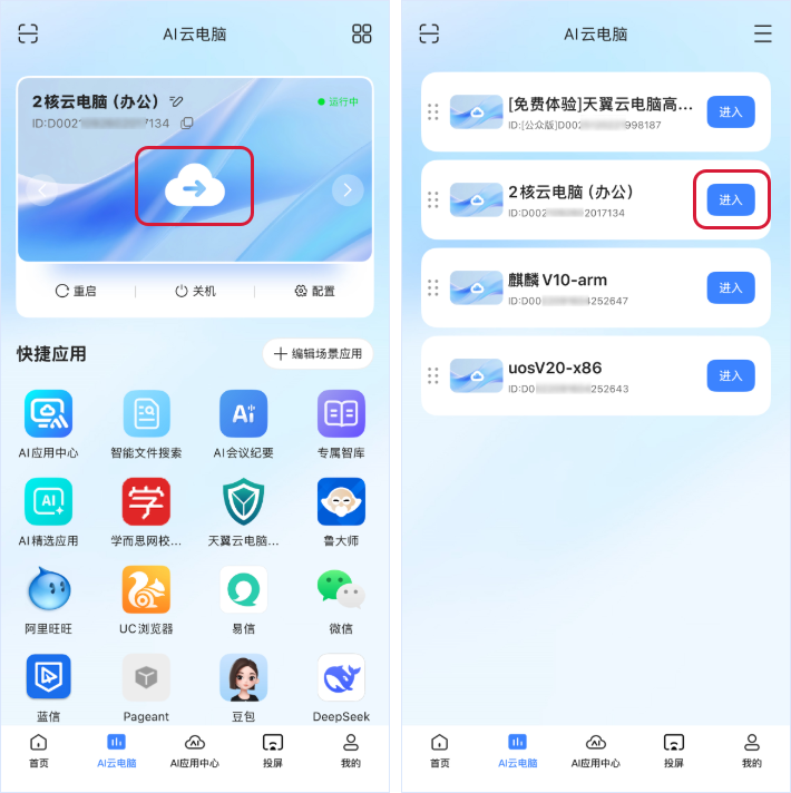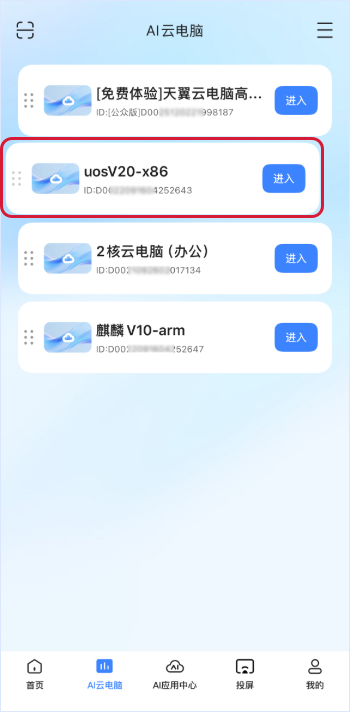 在卡片/列表视图,点击“进入”的图标或按钮,进入AI云电脑。