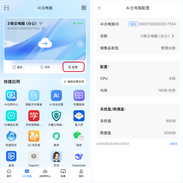 在卡片/列表视图,点击“配置”,查看AI云电脑信息ID、名称以及修改名称、AI云电脑的CPU、内存、系统盘、数据盘配置信息。