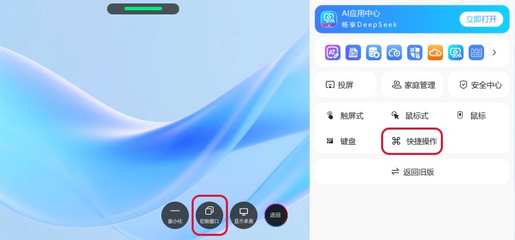 在竖屏模式下,点击悬浮球-“快捷操作”-“桌面旋转”按钮,可将桌面切换为横向显示。