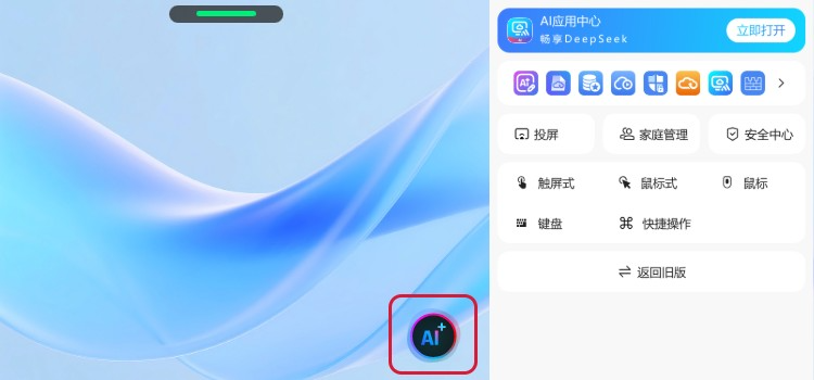 通过点击AI云电脑右下角的带有颜色的“悬浮球”,可展开手势、键盘等快捷菜单面板。