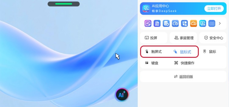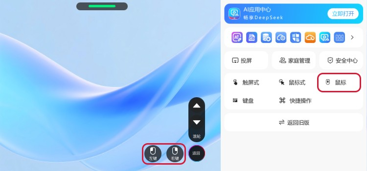 点击“鼠标式” 切换至鼠标指针式,此时AI云电脑会出现鼠标指针,鼠标模式下,手指在屏幕划动控制鼠标指针的移动。