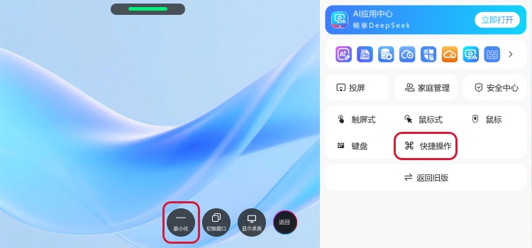 点击悬浮球-“快捷操作”-“最小化”按钮,可对当前窗口进行“最小化”操作。