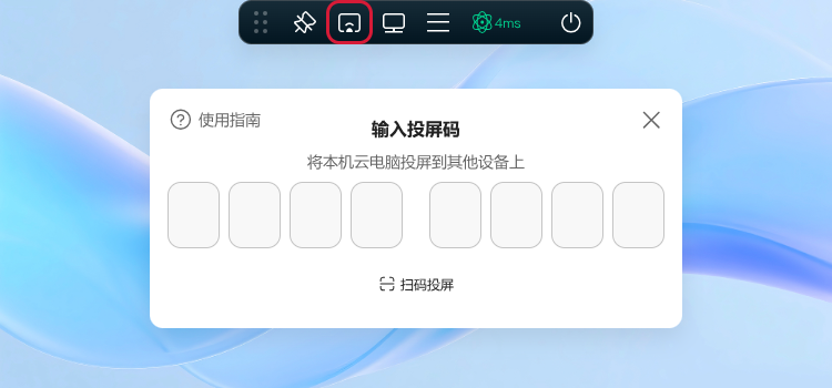 点击工具的“投屏”,设备间通过输入投屏码或扫码即可体验。