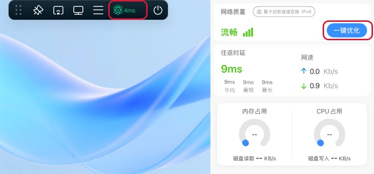 工具栏点击“网络状态”,可查看详细的网络状态,包括往返时延,网速上下行。