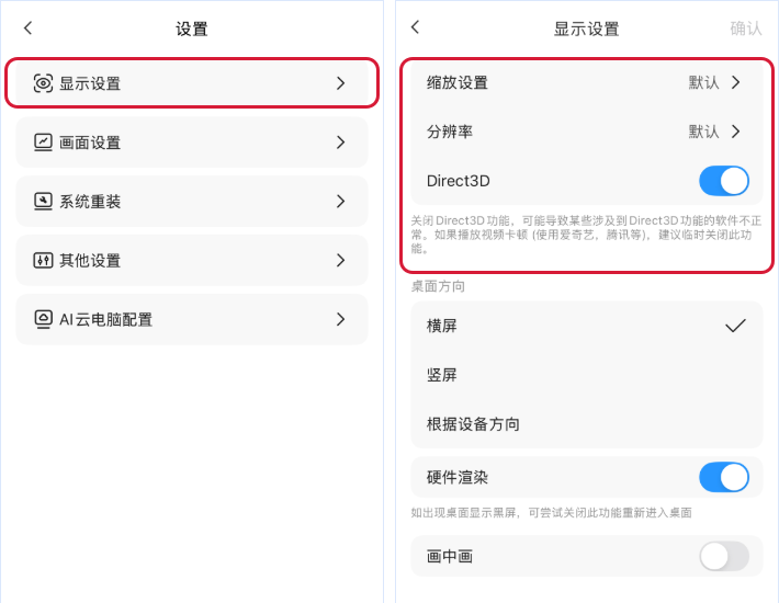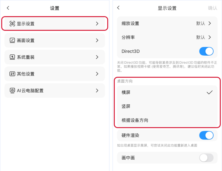 AI云电脑桌面支持横竖屏一键切换,自动适配办公、阅读、娱乐等多场景。进入“设置-显示设置”即可体验。