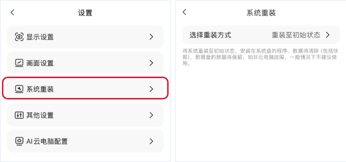 如需重装系统,进入“设置-系统重装”,系统恢复会将系统还原至初始状态,该操作会清空系统盘内所有程序与数据,非特殊情况请勿使用,并请务必提前备份重要资料耐心等待完成。