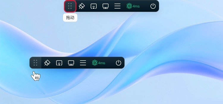 进入AI云电脑后,可在桌面顶部看到工具栏,点击“拖动”图标,支持工具栏任意位置移动,支持隐藏在桌面顶部和左右两侧屏幕边。