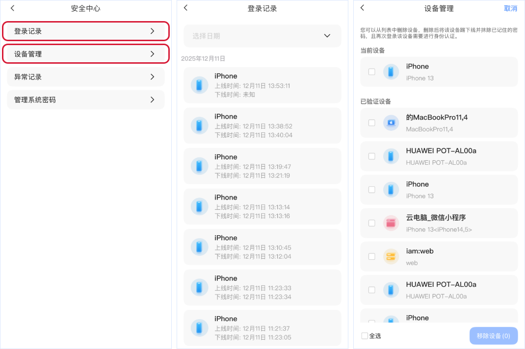 登录设备:可查看账号名称,登录设备,IP地址,登录时间以及下线时间。